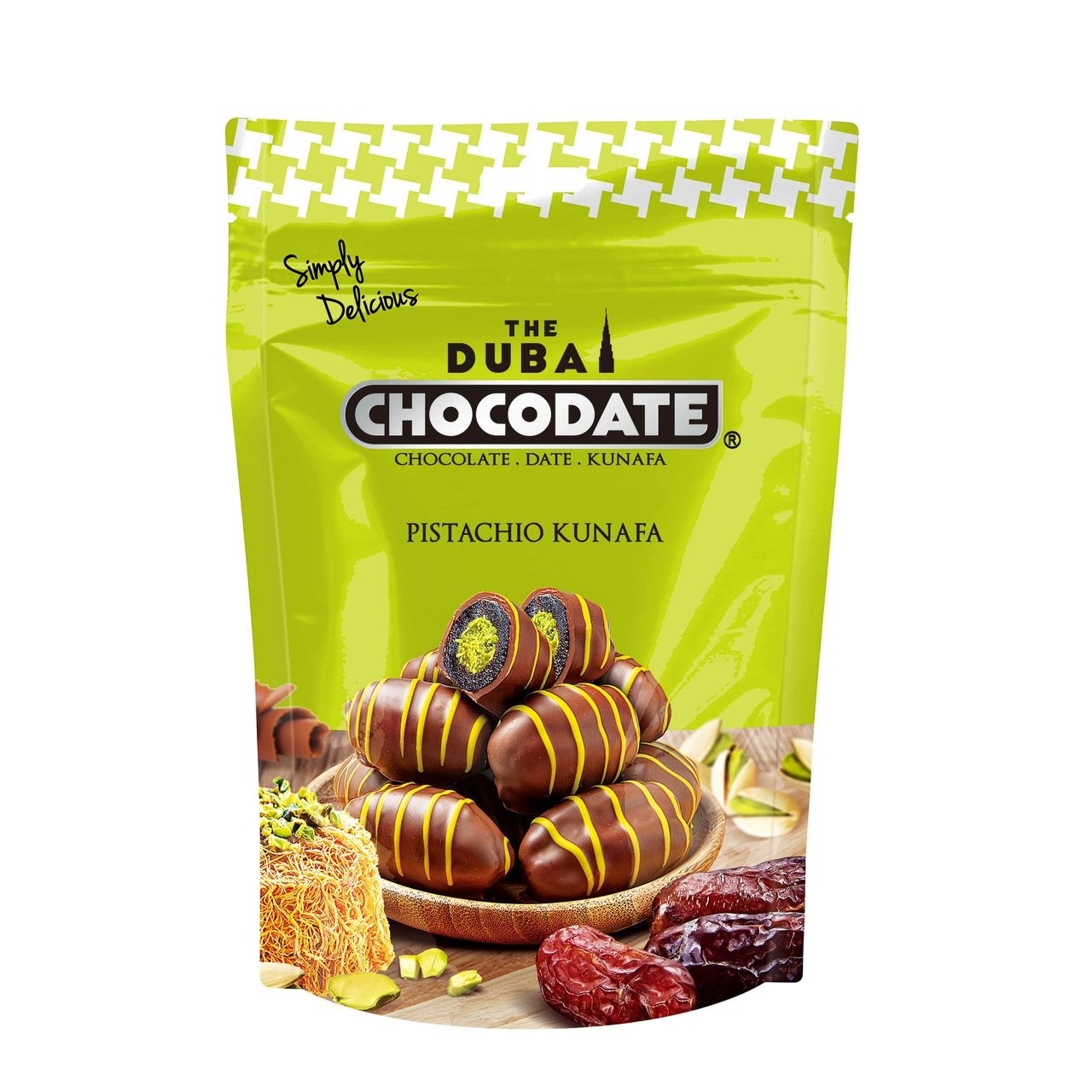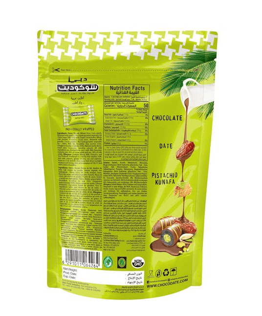 Découvrez une gourmandise fusion orientale irrésistible avec le Kunafa Chocodate Pistache : un délicieux mélange de dattes de qualité supérieure, d’un fourrage croquant aux pistaches et d’un enrobage croustillant de kunafa, le tout enrobé d’un chocolat riche et onctueux. Chaque bouchée offre une parfaite harmonie de textures : fondant, croquant, croustillant et crémeux – pour une expérience gustative unique dont vous ne vous lasserez pas.
